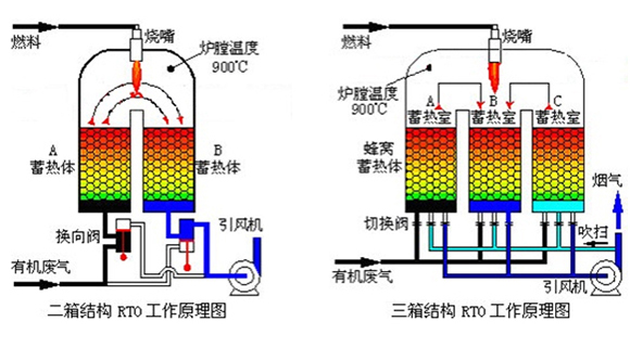 兩床RTO主體結(jié)構(gòu)由高溫氧化室、兩個(gè)陶瓷蓄熱體和四個(gè)切換閥門組成。當(dāng)有機(jī)廢氣進(jìn)入蓄熱體1后, 蓄熱體1放熱,有機(jī)廢氣被加熱到800℃左右后在高溫氧化室燃燒,燃燒后的高溫潔凈氣體通過(guò)蓄熱體2;蓄熱體2吸熱,高溫氣體則被蓄熱體2冷卻后,經(jīng)過(guò)切換閥排放。經(jīng)過(guò)一段時(shí)間,閥門切換,有機(jī)廢氣從蓄熱體2進(jìn)入,蓄熱體2放熱加熱廢氣,廢氣被氧化燃燒后通過(guò)蓄熱體1,蓄熱體1吸熱,高溫氣體被冷卻后通過(guò)切換閥排放。這樣周期性地切換,就可連續(xù)處理有機(jī)廢氣,同時(shí)無(wú)需或少量補(bǔ)充能量,達(dá)到節(jié)能效果。